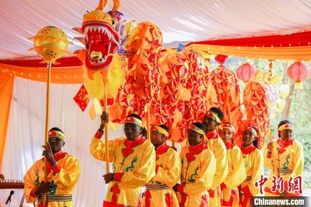 肯尼亚内罗毕大学孔子学院的学生表演舞龙。(受访者供图)