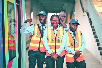 6月12日,在尼日利亚拉各斯,拉各斯轻轨蓝线项目动车组列车司机组长伊莎贝拉·亚当斯·伊斯拉埃尔(中)与同事在站台上合影。新华社发