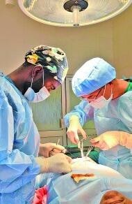 中国援赤道几内亚医疗队外科医生刘安文(右)与当地医生共同为患者做手术。新华社发