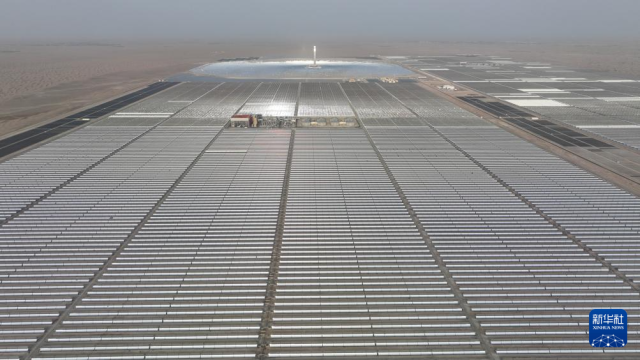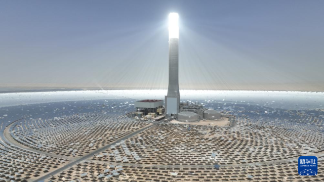 从阿联酋迪拜市区出发向南约65公里,在一望无垠的沙漠腹地,高达262米的集热塔巍然耸立,高塔下约7万面定日镜组成的镜场呈辐射状环绕延伸,从四面八方将阳光汇聚到位于塔顶的集热器上,形成一道道耀眼光束。