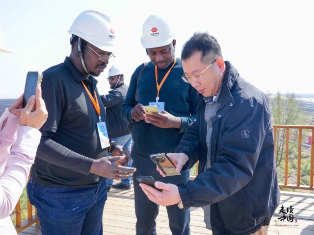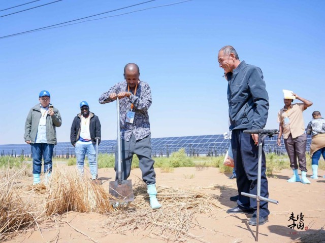 9月23日,2024“走读中国”国际媒体交流活动邀请来自非洲和亚太14个国家的记者来到宁夏回族自治区中卫市腾格里沙漠新能源基地,学习先进防风治沙理念,体验扎草方格。