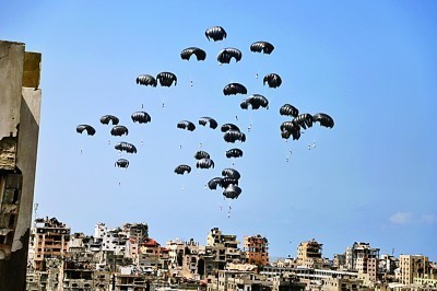 4月30日,飞机空投人道主义援助物资进入加沙地带。本轮巴以冲突爆发以来,加沙地带食品严重缺乏,面临饥荒。新华社发