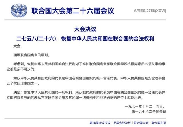 1971年10月25日,第26届联合国大会以压倒性多数通过第2758号决议,决定恢复中华人民共和国在联合国的一切合法权利,承认中华人民共和国政府代表是中国在联合国的唯一合法代表。中国人民大学两岸关系研究中心主任王英津表示,联大第2758号决议从政治、法律和程序上解决了包括台湾在内全中国在联合国的代表权问题,明确不存在“两个中国”,不存在“一中一台”。
