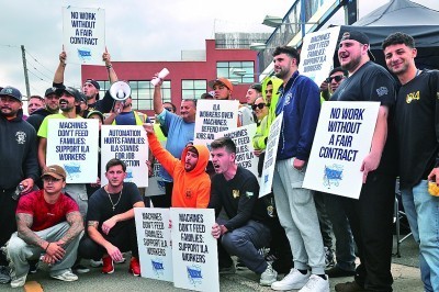 10月1日,工人在美国纽约市布鲁克林雷德胡克集装箱码头参加罢工,要求涨薪。新华社发