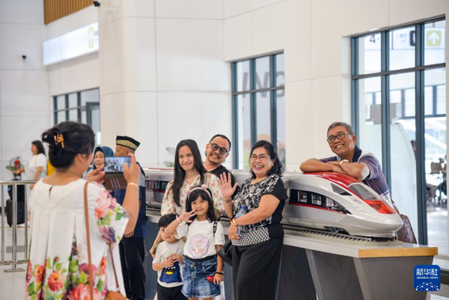 6月17日,在印度尼西亚雅加达哈利姆站候车大厅,人们和雅万高铁高速动车组模型合影。新华社记者 徐钦 摄