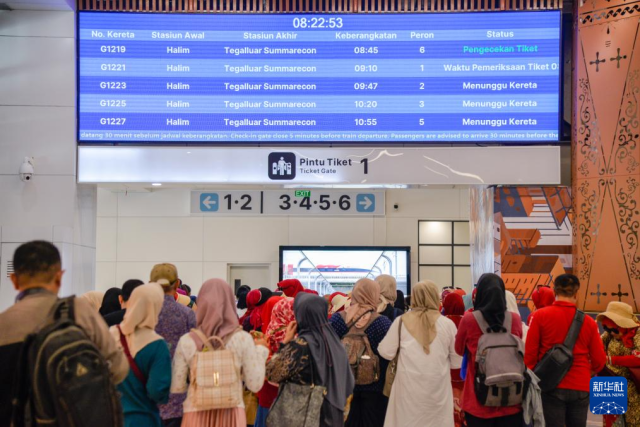 10月11日,在印度尼西亚雅加达,乘客在雅万高铁哈利姆站候车大厅排队进站。新华社记者 徐钦 摄