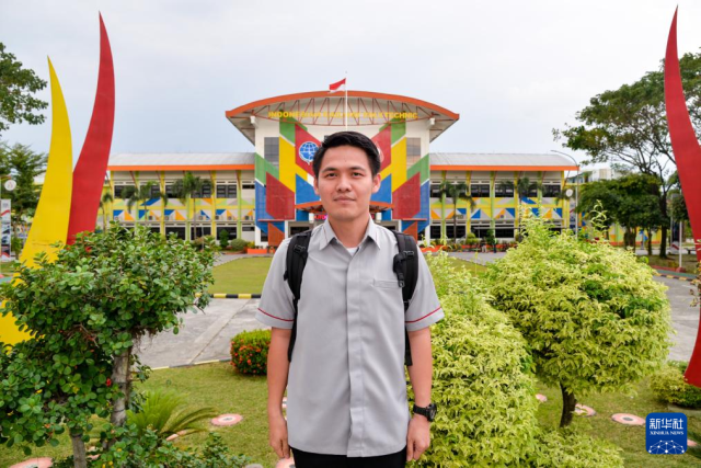 2023年6月7日,在位于印度尼西亚茉莉芬的印尼铁路理工学院,雅万高铁首批司机塞蒂亚万拍照留念。新华社记者 徐钦 摄