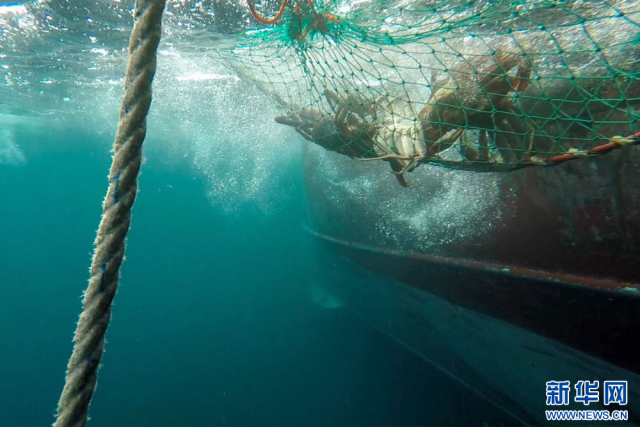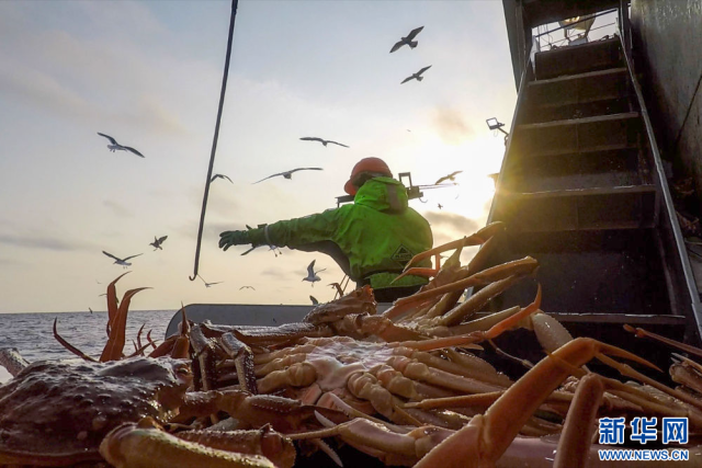 金秋时节,俄罗斯远东堪察加半岛附近的海域上,俄罗斯蟹业集团的捕捞船在风浪中紧张作业,工作人员对捕捞的帝王蟹进行收网、挑选、加工、装箱、储存,准备装运。一整套流程在捕捞船上有条不紊地进行……