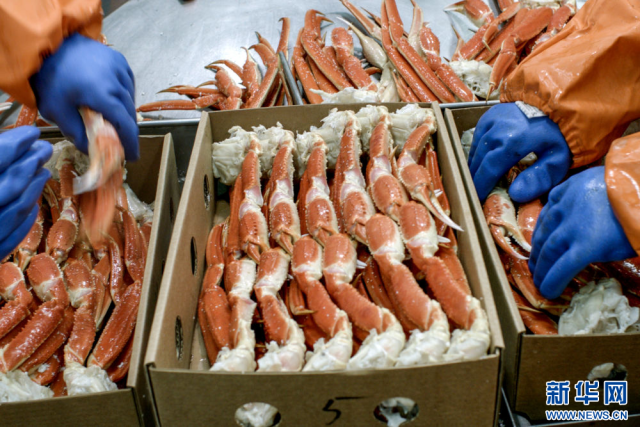 俄罗斯蟹业集团的工作人员在生产线上加工产品。
