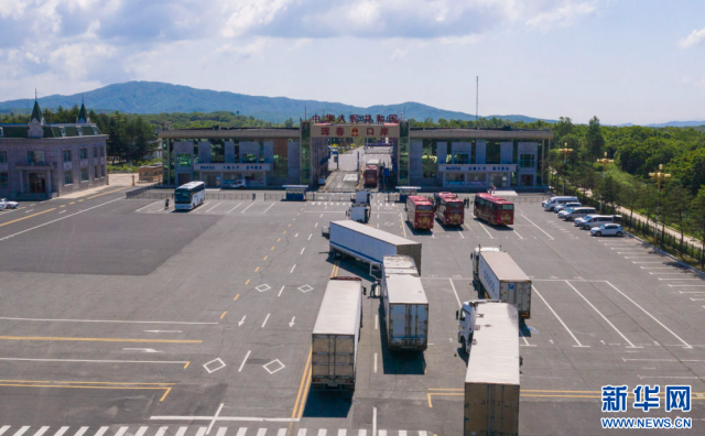往返于中国和俄罗斯的货车在中俄珲春口岸前排队等待通关。