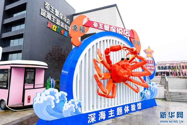 游客在吉林省珲春市一处帝王蟹元素主题装饰前拍照留念。
