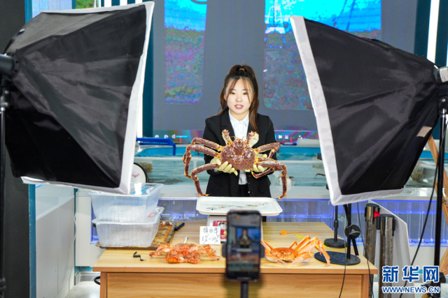 在珲春帝王蟹保税店内,工作人员进行网络直播售卖帝王蟹。