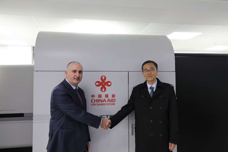 10月18日,中国驻格鲁吉亚大使周谦与格鲁吉亚财政部部长拉沙·胡齐什维利在中国援格设备前握手合影。中国驻格鲁吉亚大使馆供图