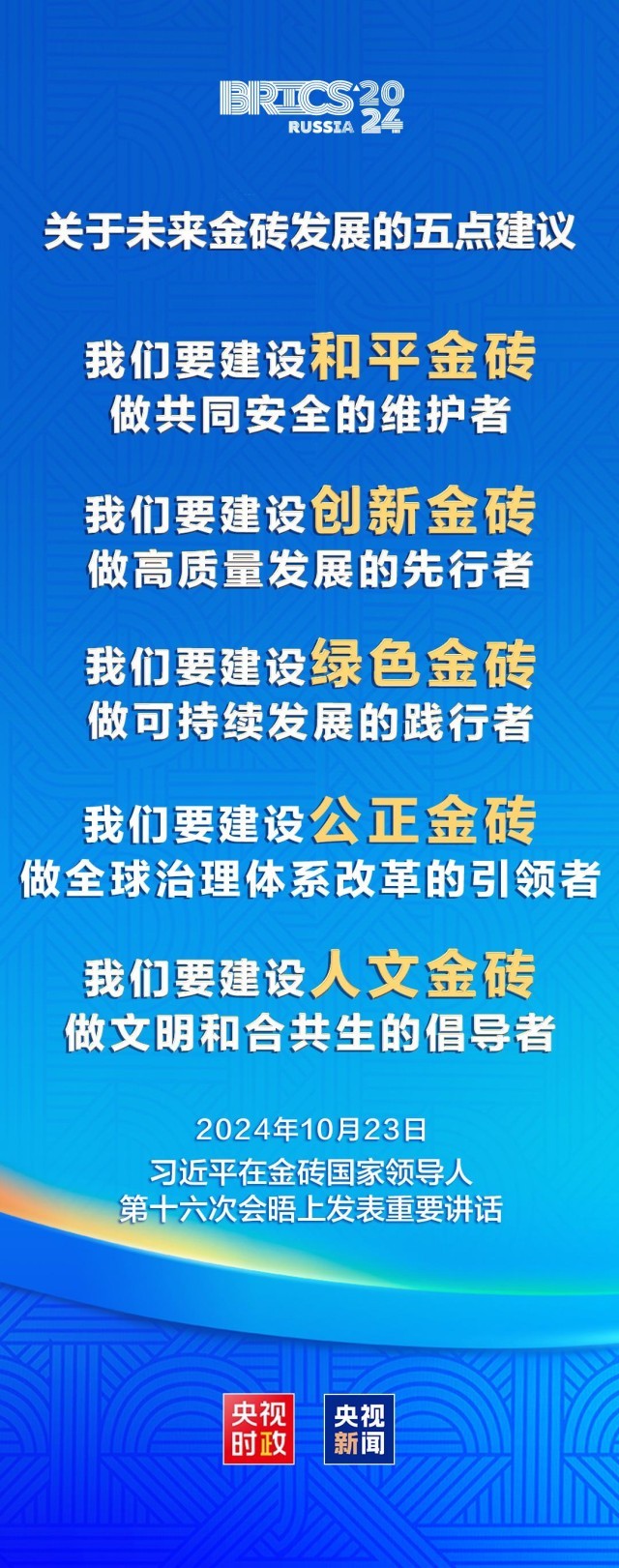各国领导人共商金砖合作大计、发表《喀山宣言》、宣布设置金砖伙伴国……当地时间23日,金砖国家领导人第十六次会晤在俄罗斯喀山成功举行。在这场金砖扩员后的首次峰会上,中国国家主席习近平发表重要讲话,强调要把金砖打造成促进“全球南方”团结合作的主要渠道、推动全球治理变革的先锋力量,倡议各方携手建设“和平金砖”“创新金砖”“绿色金砖”“公正金砖”“人文金砖”,并宣布了一系列具体举措,引发国际社会热议。