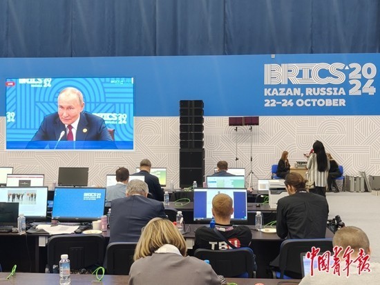 10月23日,俄罗斯喀山,金砖国家领导人第十六次会晤吸引59个国家的2000余名新闻媒体工作人员前往报道。图为峰会新闻中心大屏幕上播放俄罗斯总统普京参会的画面。中青报·中青网记者 赵祺/摄