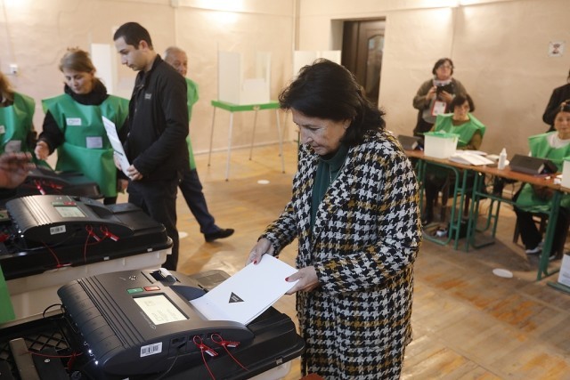 10月26日,格鲁吉亚第比利斯,议会选举期间,格鲁吉亚总统祖拉比什维利在投票站投票。视觉中国供图