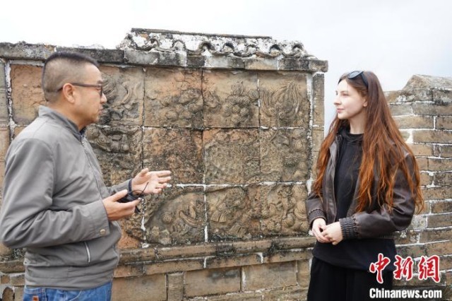 登上金山岭长城小狐顶楼的二楼,娜斯佳立刻被一座高2米、宽2.5米,由15块砖雕组成的麒麟影壁墙吸引。“这个影壁墙上的麒麟脚踏祥云,有什么寓意吗?”娜斯佳有些好奇。
