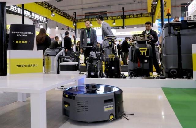 11月6日,一台卡赫全新智能扫拖机器人RCV 5 Plus(前)在进行作业演示。这是该产品在进博会上的首展首发。新华社记者 方喆 摄