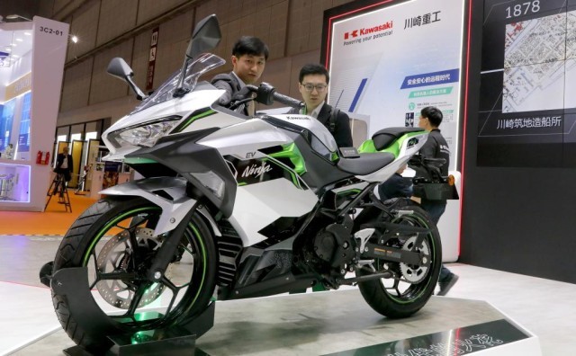 11月6日,工作人员(左)在川崎公司展台为参观者介绍一款电动摩托车。这是该产品在进博会上的首展。新华社记者 方喆 摄