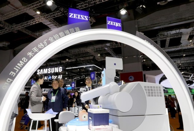 11月6日,参观者在蔡司公司展台展出的新一代机器人全飞秒前交流讨论。这是该产品在进博会上的首展。新华社记者 方喆 摄