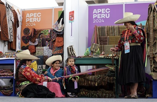 11月12日,秘鲁利马,在亚太经济合作组织(APEC)峰会国际媒体中心,参加秘鲁手工艺品及传统艺术展销的参展商进行现场制作展示。视觉中国供图