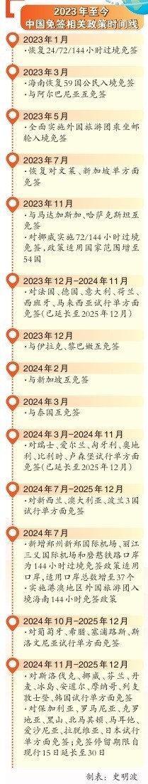 【环球时报综合报道】编者的话:自去年年底至今,中方先后对38个国家实行免签,目前累计同25个国家实现全面互免签证。同时,通过优化签证申请表、取消签证预约、扩大免采指纹范围、调减签证规费等措施,来华签证手续也变得更加高效便捷。随着免签政策的红利持续释放,来华旅游已成为外国游客的“流量密码”,也是彰显中国扩大高水平开放决心的“政策名片”。接受《环球时报》记者采访的业内人士普遍观察到,过去一年来,免签政策给中国入境游和中外民间交流带来了从量到质的全方位提升。有业内人士预测,2025年,中国免签政策的效果会得到更加可观的显现。