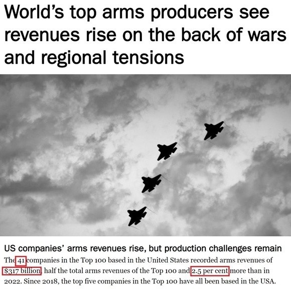 数据显示,这41家美国军工企业去年的销售收入达到3170亿美元,较2022年增长了2.5%,占到全球前100大武器制造商去年总收入的一半。