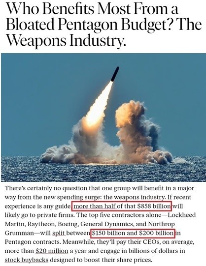 美国《国家》杂志等媒体此前的报道称,美国的军工五巨头(波音、通用动力、洛克希德 马丁、诺斯罗普 格鲁曼和雷神公司)每年能从五角大楼获得价值1500至2000亿美元的合同,占五角大楼总预算的近20%。