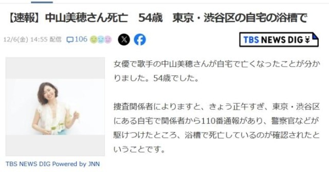 中新网12月6日电 据日本TBS新闻网报道,当地时间6日,日本女演员、歌手中山美穗被发现已在自己家中去世,终年54岁。