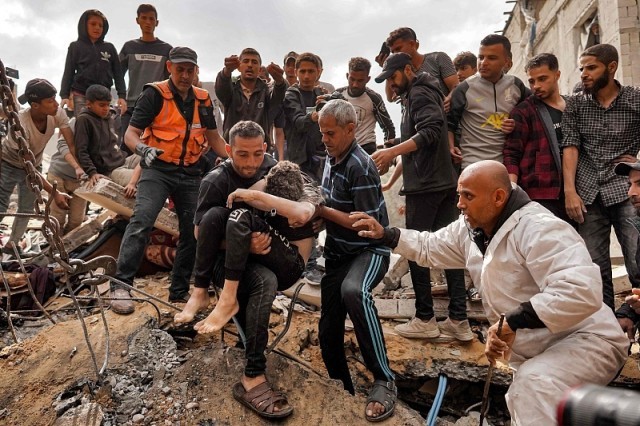 △5月14日,加沙地带努赛赖特难民营遭以军轰炸,人们从建筑废墟下找到一名遇难儿童。