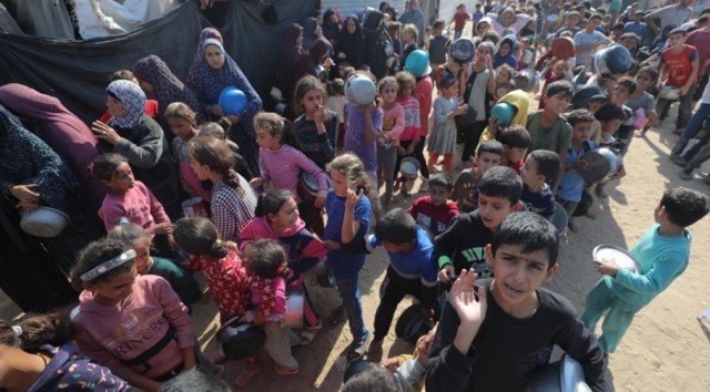 △5月14日,加沙地带汗尤尼斯的一些儿童等待领取食物。