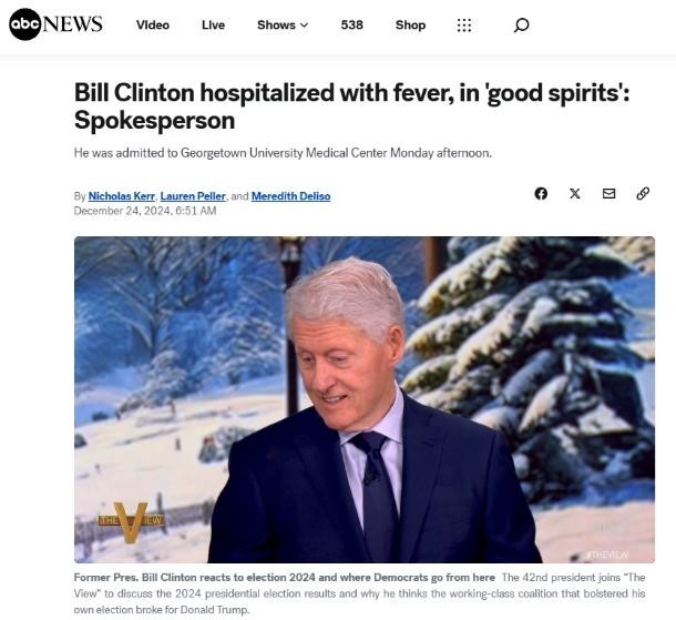 中新网12月24日电 据美国广播公司(ABC)报道,当地时间23日,78岁的美国前总统比尔·克林顿发烧后入院接受治疗。