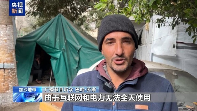临时广播电台主持人 阿卜杜拉·迈加里:我们很难获得互联网服务,然后就有了这个(运营电台的)想法。我们开始在帐篷里播出贴近人们和他们所关心问题的节目。我们在加沙地带的中心会接到来自北部和南部,以及整个加沙地带的电话,人们打电话提出他们的问题和担忧。我们也会从手机收到短信,并在直播中读出来。