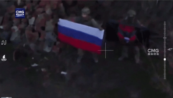 △俄军士兵在库拉霍沃展示俄罗斯国旗