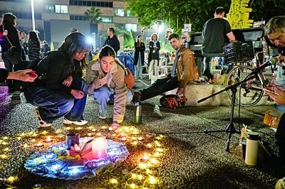 1月15日,卡塔尔首相兼外交大臣穆罕默德在卡塔尔首都多哈宣布,以色列与巴勒斯坦伊斯兰抵抗运动(哈马斯)已就加沙地带停火达成协议。图为当晚,在以色列特拉维夫一处广场,人们点亮蜡烛祈祷所有被扣押人员都能平安回家。新华社记者 陈君清摄