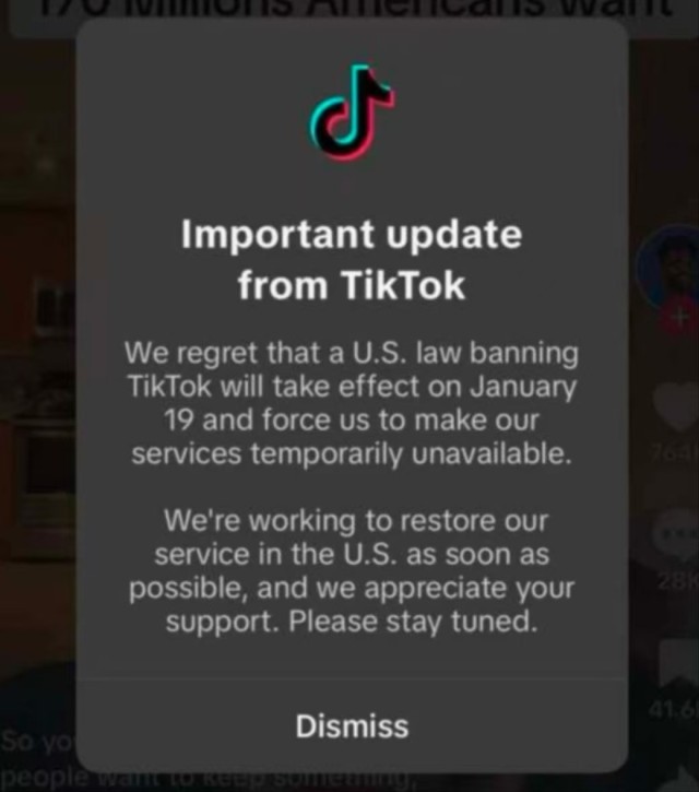 TikTok公司早前发布的通知内容显示:我们很遗憾,一项封禁TikTok的美国法律将于1月19日生效,并迫使我们暂时停止提供服务。我们正尽快努力在美国恢复我们的服务,我们感谢各位的支持。请保持关注。