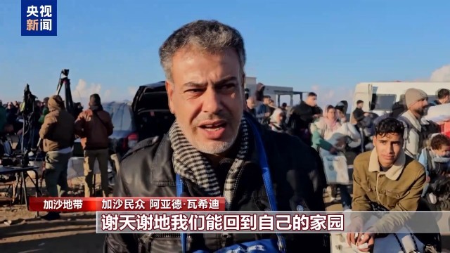 总台报道员 奥萨马·阿什:数以万计的人今天暂时结束了流离失所的日子。他们曾经被迫从加沙地带北部逃到南部避难,如今,他们可以返回自己的家园,但家园已经被破坏。没有人不知道接下来的日子会怎样。