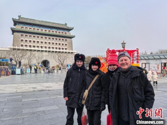 1月26日,在正阳门箭楼前,波兰高中生斯坦尼斯拉夫(左一)与家人合影留念。中新社记者 刘玥晴 摄