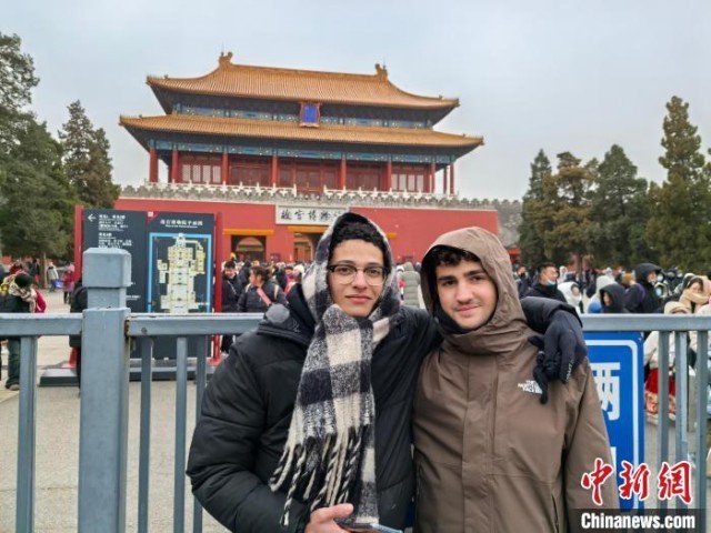 1月26日,在故宫博物院神武门前,西班牙游客奥勒(左)与好友合影留念。中新社记者 刘玥晴 摄