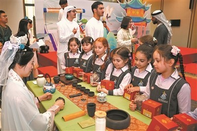在中国驻迪拜总领事馆举办的“邂逅花间——宋代雅集走进总领馆”活动上,迪拜慈善小学的孩子们在观看中国古代茶艺展示。 本报中东中心分社 塔里克·易卜拉欣 摄