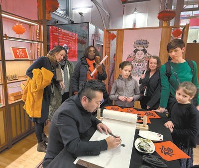 比利时民众阿丽娜带着两个儿子参加活动。她告诉记者:“我们就住在中国文化中心附近,经常来这里观看各种展览。今天的活动太充实了,我的孩子体验了拓印福字,亲手完成了福字剪纸,更收获了画家张文海现场书写的福字。更为开心的是,我们还欣赏了昆曲《牡丹亭》,虽然听不懂唱词,但是优美的曲调和精致的服饰让我们内心也收获了一个大大的幸福。春节代表的温馨和幸福寓意是全世界都需要的。”