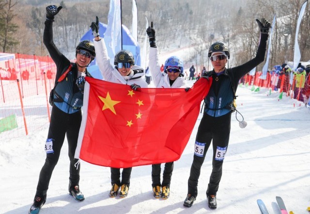 2月12日,冠军次旦玉珍(右二)/布鲁尔(右一)、亚军于婧萱/毕禹新(左一)在哈尔滨亚冬会滑雪登山混合接力决赛后庆祝。新华社记者 杨青 摄