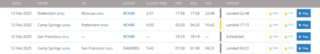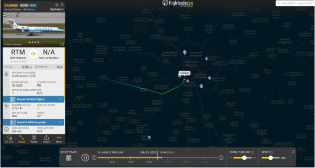据行程显示,这架军用机型号为C-37B,隶属美国空军。当地时间13日凌晨,飞机自美国马里兰州的安德鲁斯空军基地起飞,在短暂经停荷兰鹿特丹后,于当地时间13日晚22点48分抵达莫斯科伏努科沃国际机场。
