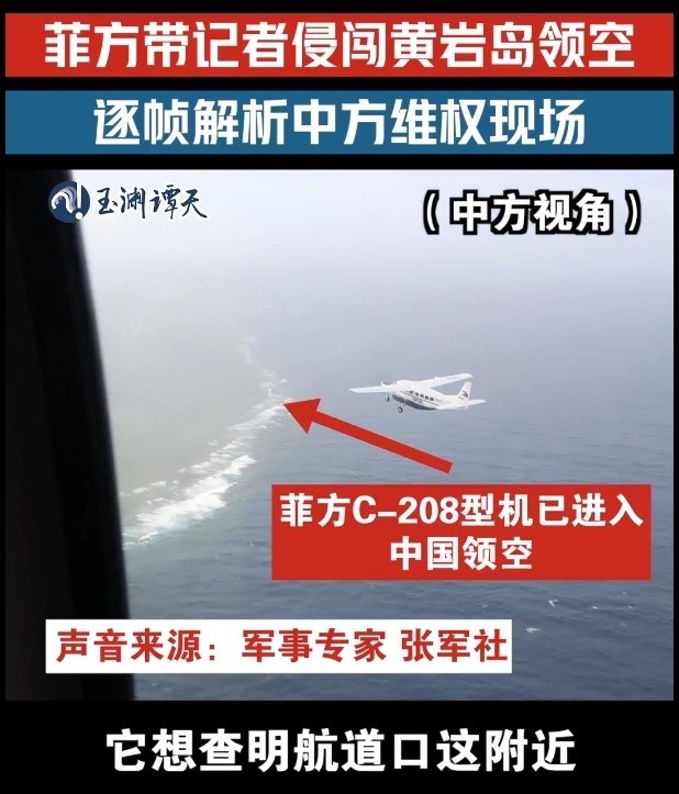 2月18日,菲1架C-208型机非法闯入中国黄岩岛领空,多次擅自改变飞行高度,218秒降高920米,以不专业、危险方式,蓄意近距穿越我在空正常巡逻直升机高度层,极易引发海空不测事件。