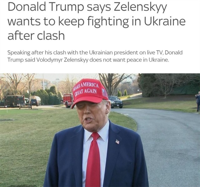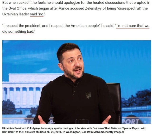 “我在椭圆形办公室看到的是(泽连斯基对美国的)不尊重。我不知道我们能不能与泽连斯基恢复谈判。还是那句话,他要么辞职,然后派一个可以与我们合作的人过来,要么他自己做出改变。”