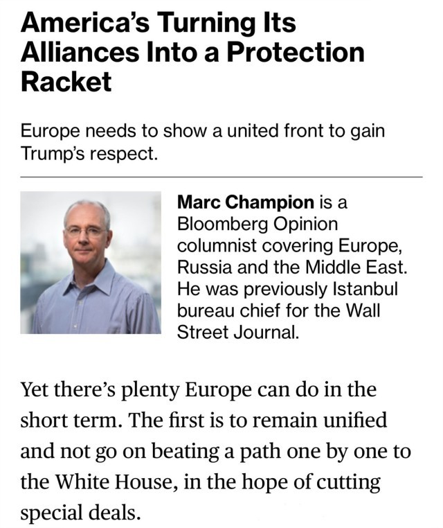 在彭博社专栏作家马克·钱皮恩看来,特朗普政府奉行的“美国优先”政策导致跨大西洋关系裂痕不断加深。欧洲领导人应保持团结,而不是一个接一个前往白宫,希望与美达成特殊协议。