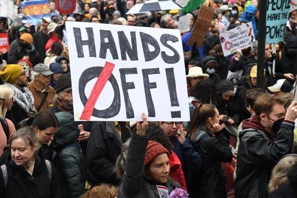 4月5日,美国纽约,教师、护士、工会成员、学生等冒着恶劣天气走上街头,高举“住手”标语牌,抗议特朗普政府的关税、移民政策。视觉中国供图