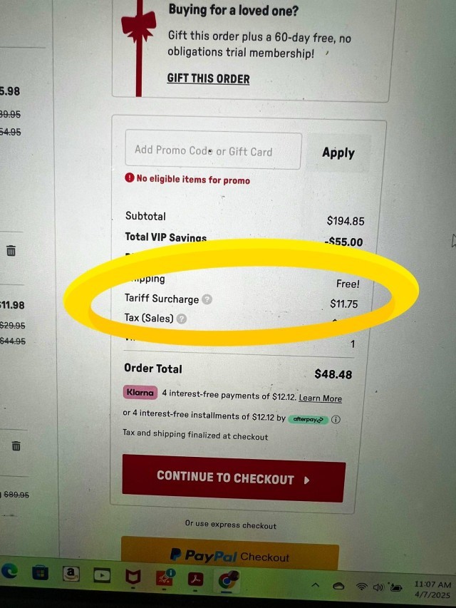 一位美国网友晒出的账单表明,此次消费被收取了11.75美元的关税附加费。