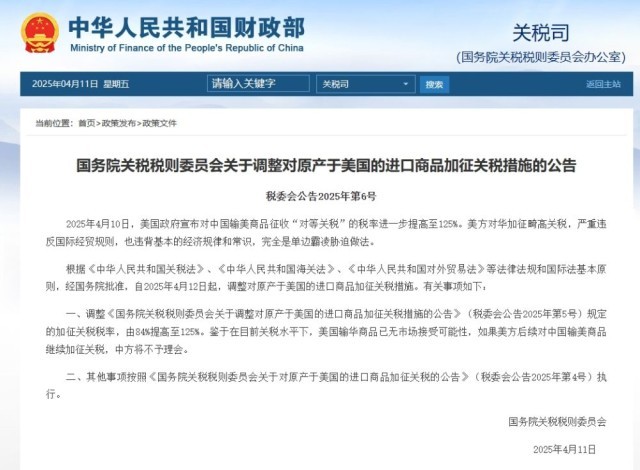 一、调整《国务院关税税则委员会关于调整对原产于美国的进口商品加征关税措施的公告》(税委会公告2025年第5号)规定的加征关税税率,由84%提高至125%。鉴于在目前关税水平下,美国输华商品已无市场接受可能性,如果美方后续对中国输美商品继续加征关税,中方将不予理会。