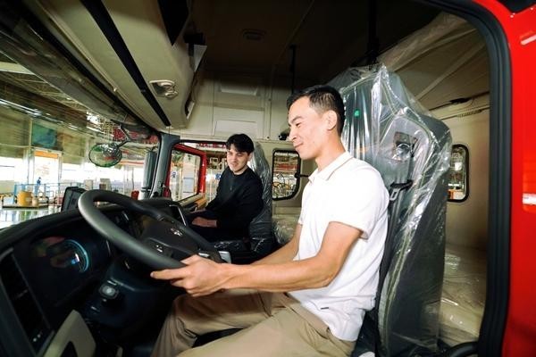 4月10日,陕西西安,2025“未来之桥”中国-中亚青年领导人研修交流营期间,中亚青年代表在参观陕西汽车控股集团有限公司汽车总装配厂时,体验驾驶德龙X6000牵引车。共青团陕西省委供图